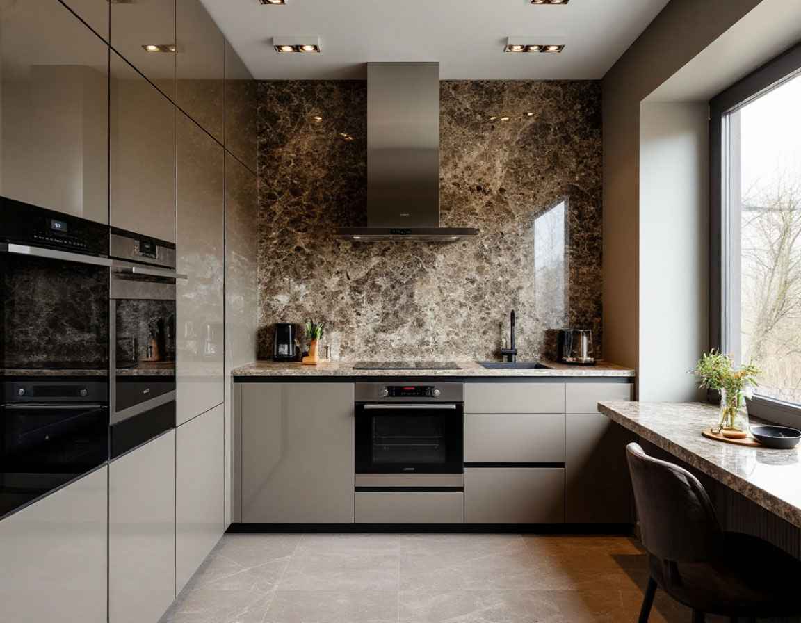 Совет дизайнера: выберите серый керамогранит под бетон или однотонную плитку с сатиновым эффектом. Добавьте акцентную подсветку под навесными шкафами — кухня сразу станет «легче».