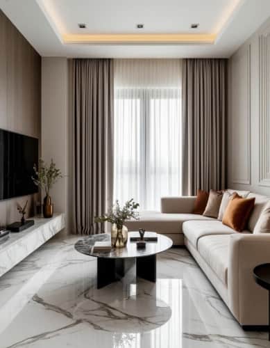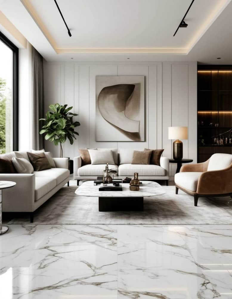 Зимой поверх холодного мрамора отлично ложатся теплые фактуры — шерстяной ковер, бежевые подушки, латунные или бронзовые детали. Атмосфера сразу становится уютной, камерной, как в скандинавских интерьерах.