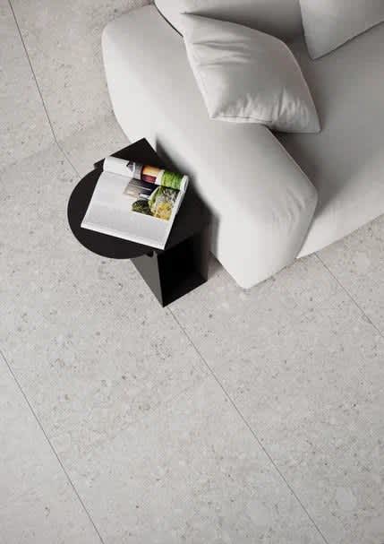 Крупноформатная плитка — как универсальный гардероб: базовый костяк, который легко «переодеть» под лето или зиму. Достаточно немного декора, текстиля и света — и атмосфера в гостиной меняется кардинально.