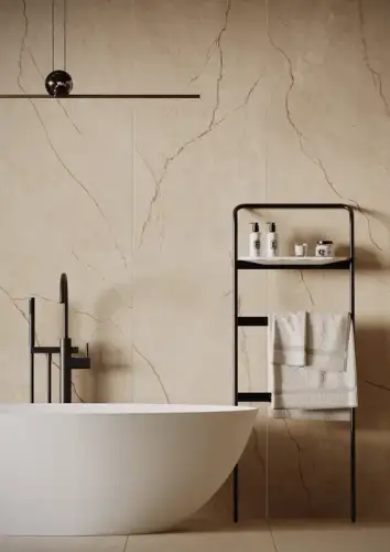Ванная любит безопасность и блеск. Здесь идеально подойдет плитка с матовым покрытием. Цвета — светлые, пастельные, с легким «мраморным» или иным каменным эффектом, как в коллекции Полдень. В такой атмосфере будет приятно согреться и расслабиться после долгого дня.
