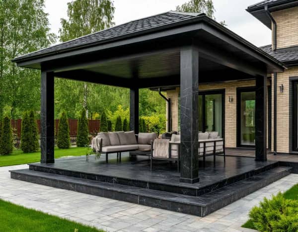 Пример: серый или графитовый керамогранит под камень для террасы создает эффект дорогого природного покрытия, при этом не требует ухода, как настоящий камень.